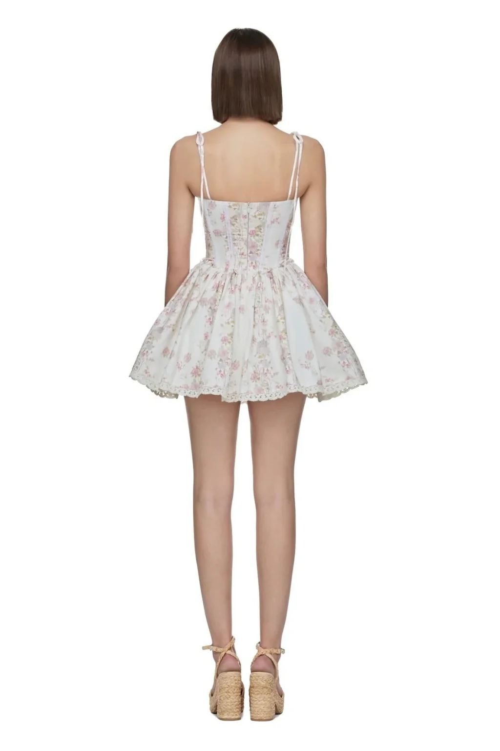 The Sasha Jumpsuit features a design rich in feminine details. With a corset-style bodice secured by hooks at the center, crafted from floral-printed fabric, it offers a delicate yet bold look. The V-shaped lace stitching and the bow tie details on the shoulders add a touch of playful femininity and free-spirited charm.